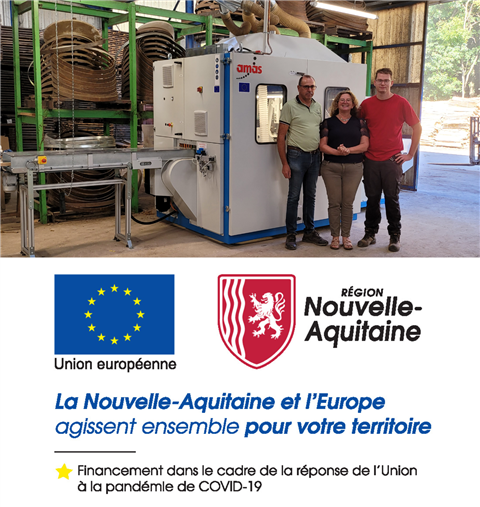 En 2023 La famille Bertrand, fondatrice de la Tonnellerie de Saint Georges, pose fièrement devant la nouvelle jointeuse à commande numérique.